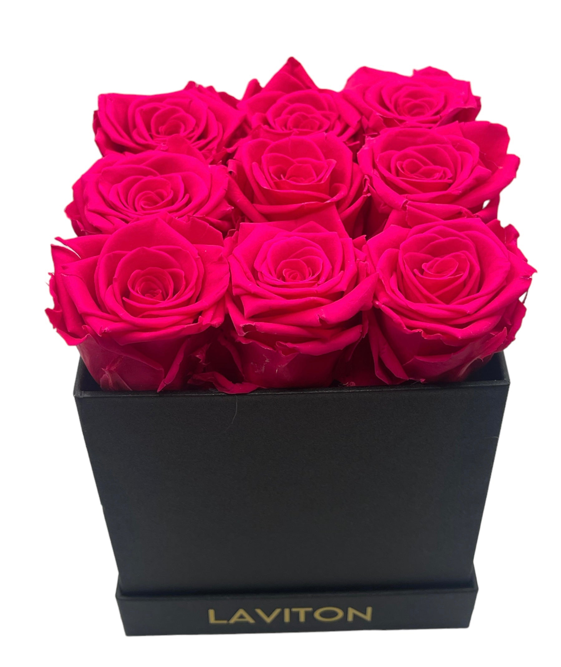 Nine hot pink eternity roses arranged in a classic box. The Square box of roses is the perfect gift or home decor accent